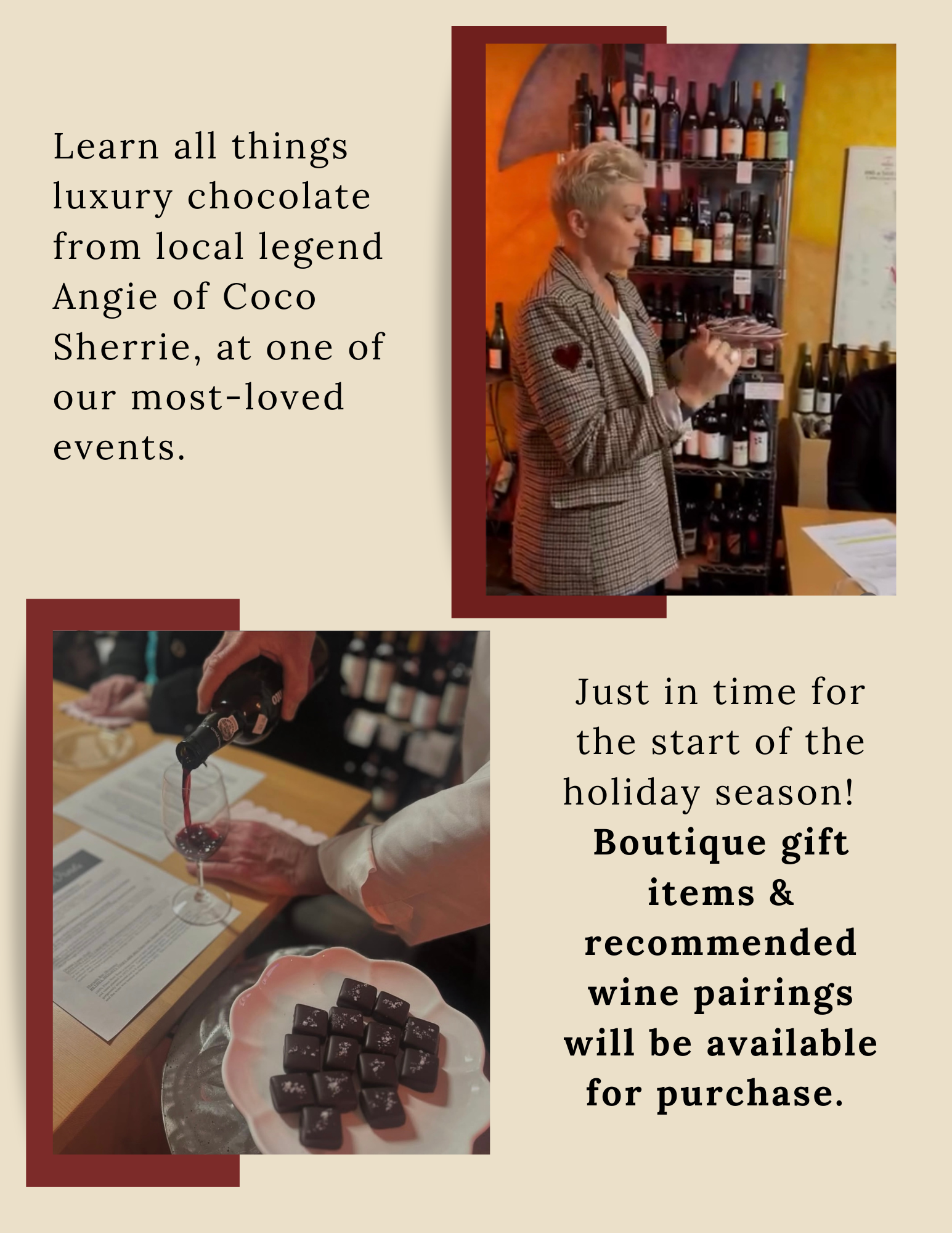Join us for our 6th annual event featuring Angie Fields, the talented owner of CocoSherrie, a beloved local chocolatier. Prepare to be delighted as we pair Angie’s decadent confections with six exquisite wines, thoughtfully hand-selected by Ed.